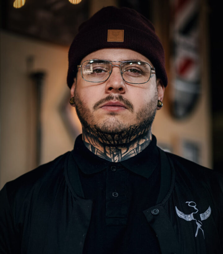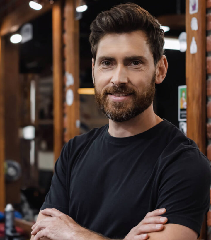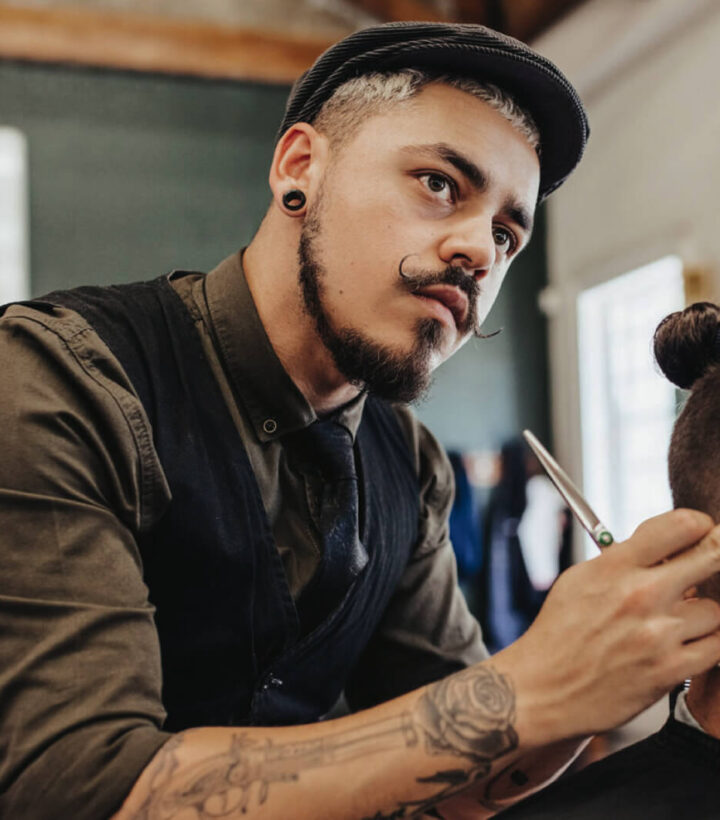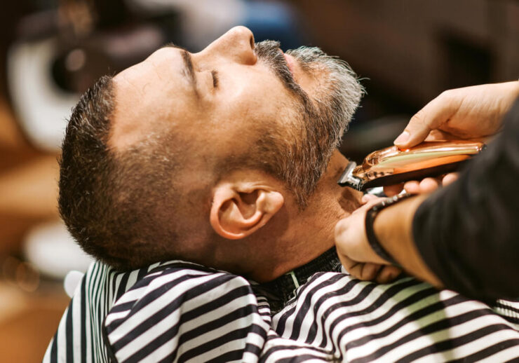 Aparar, modelar e definir a barba e o bigode com precisão, usando ferramentas profissionais para um contorno limpo e um estilo sob medida.